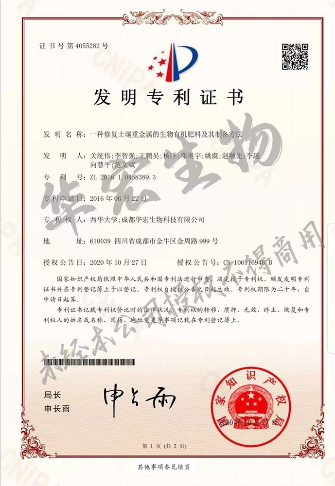 一種修復(fù)土壤重金屬的生物有機(jī)肥料及其制備方法專(zhuān)利證書(shū)