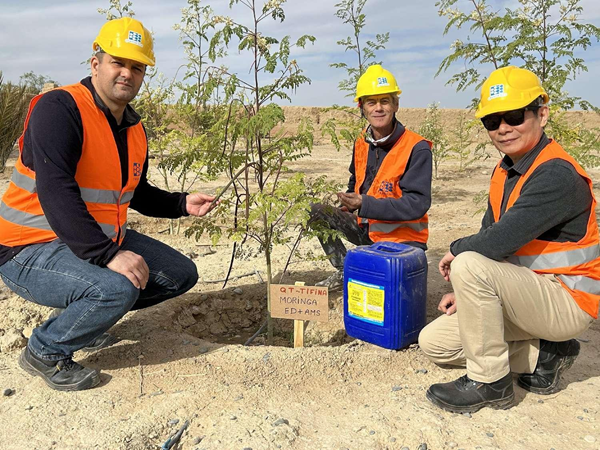 2022年11月25日下午納賽爾主席、王永葆會(huì)長(zhǎng)在摩洛哥撒哈拉沙漠中的綠洲小鎮(zhèn)伊爾福德, “中非鹽水農(nóng)業(yè)示范農(nóng)場(chǎng)”改良土壤實(shí)驗(yàn)現(xiàn)場(chǎng),這幾棵樹(shù)使用改良劑30天表現(xiàn)