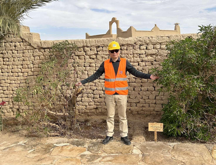 2022年11月25日下午王永葆會(huì)長(zhǎng)在摩洛哥撒哈拉沙漠中的綠洲小鎮(zhèn)伊爾福德, “中非鹽水農(nóng)業(yè)示范農(nóng)場(chǎng)”改良土壤實(shí)驗(yàn)現(xiàn)場(chǎng),在駐地旁這棵樹(shù)使用改良劑60天,與對(duì)照樹(shù)