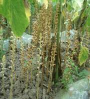 列當屬一種根寄生植物,列當種子在土壤中接觸到向日葵的根時,受根部分泌物的刺激而萌發(fā),形成吸根(盤)深入到寄主根部吸收營養(yǎng)。同時在根外發(fā)育成膨大部分,向上形成花莖,向下形成大量吸盤,每株可形成5-10萬粒種子。每年在7月上旬陸續(xù)萌發(fā)出土。重茬和低溫地發(fā)病較重。一般被列當寄生后的向日葵,株高降低10%,莖粗減少4.4%~33.3%,花盤直徑縮小23%~36%。種子飽滿度降低36.4%。