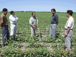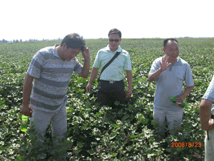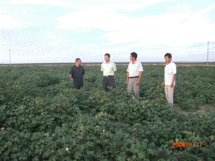 圖3:公司技術(shù)員與農(nóng)六師共青團(tuán)在察看棉田 圖4:察看和豐縣私人農(nóng)場(chǎng)