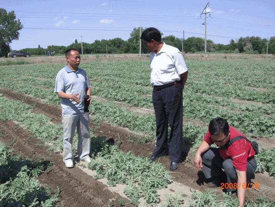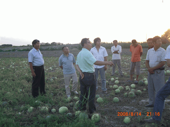 2008年,公司土壤改良劑在新疆兵團(tuán)124團(tuán)9連打瓜地里的試驗(yàn)示范圖片