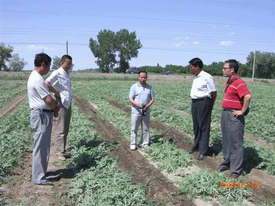 圖為:公司總經(jīng)理、總農(nóng)藝師和團(tuán)場技術(shù)員在124團(tuán)9連打瓜地里察看