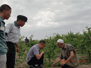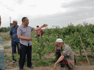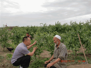 2012年7月17日,公司董事長(zhǎng)兼總經(jīng)理李智強(qiáng)到本公司產(chǎn)品土壤改良劑“施地佳”試驗(yàn)地——新疆新和縣紅棗種植基地考察并和大棗種植戶的維族老人屈膝交談。