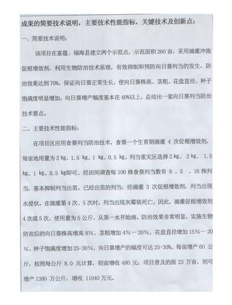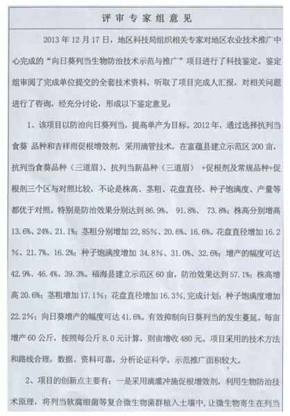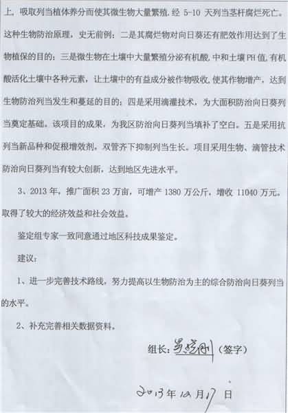 下面是新疆阿勒泰地區(qū)農業(yè)技術推廣中心用成都華宏生態(tài)農業(yè)科技有限公司生產的微生物菌肥成功攻克寄生在向日葵上的列當后,阿勒泰地區(qū)科技局對其成果的評審鑒定結果:具有先進性、創(chuàng)造性、成熟性、科學性,向日葵增產達到40%,其防治技術填補了阿勒泰地區(qū)空白。