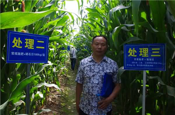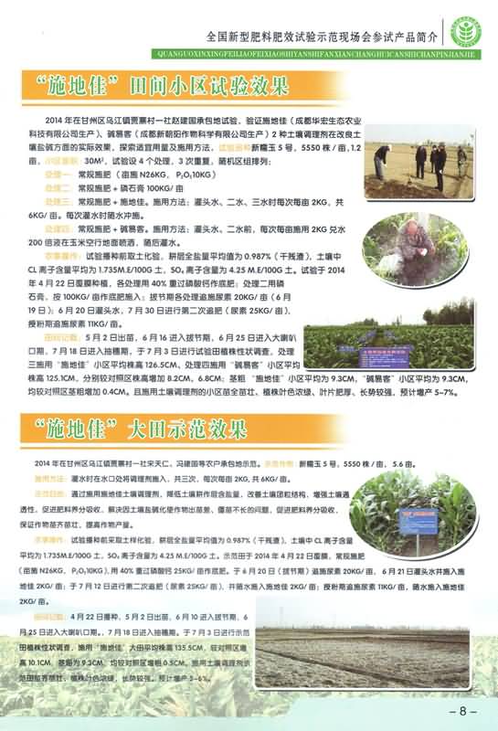 2014年8月21日,“2014年新型肥料肥效試驗現(xiàn)場培訓在甘肅張掖市召開”。來自全國各省、市相關技術人員共計100余人參加培訓。成都華宏生態(tài)農業(yè)科技有限公司總經理李智強,攜公司高管參加了這次培訓。與會人員還參觀了全國農技推廣服務中心在全國選出的七個新型肥料品種在張掖市的試驗示范。成都華宏生態(tài)農業(yè)科技有限公司自主研發(fā)的“施地佳”土壤調理劑也被安排在甘州區(qū)烏江鎮(zhèn)賈寨村一社趙建國的承包地試驗,試驗作物是玉米。根據(jù)田間記載:4月22日播種,5月2日出苗,6月10進入拔節(jié)期,6月25日進入大喇叭口區(qū)期。7月18日進入抽穗期。于7月3日進行示范田植株性狀調查,施用“施地佳”土壤調理劑,大田平均株高135.5cm,較對照區(qū)增高10.1cm,莖粗為9.3cm,均較對照區(qū)增粗0.5cm,施用“施地佳”土壤調理劑后,示范田苗齊苗壯、植株葉色濃綠,長勢較強。預計增產5—6%。