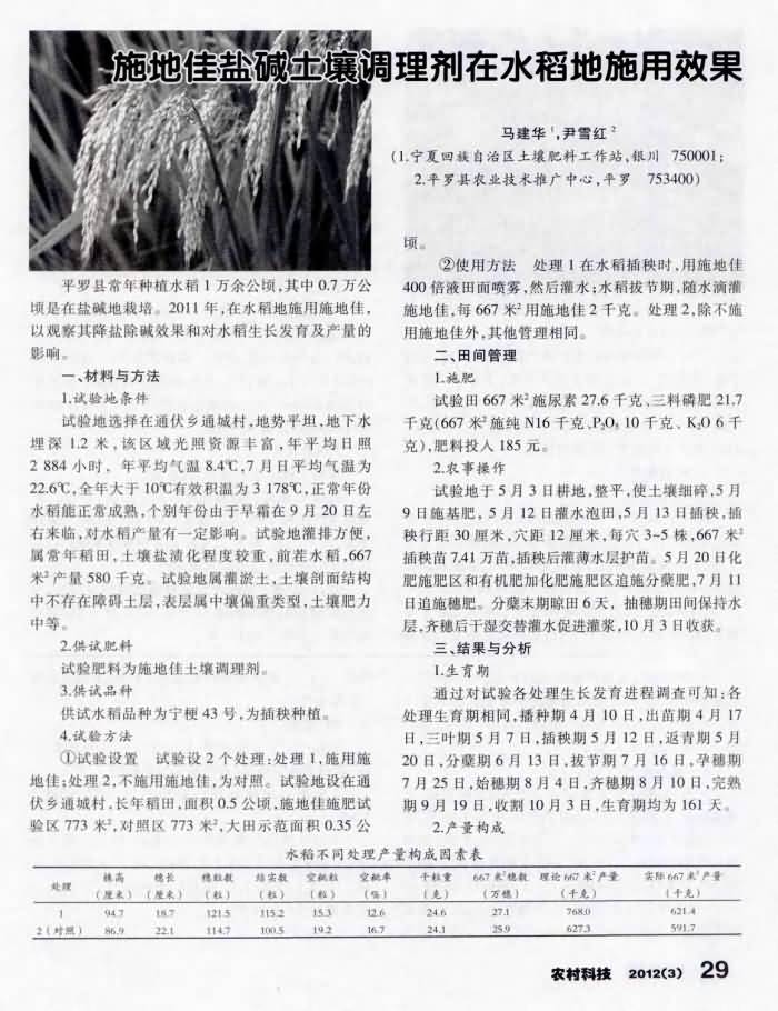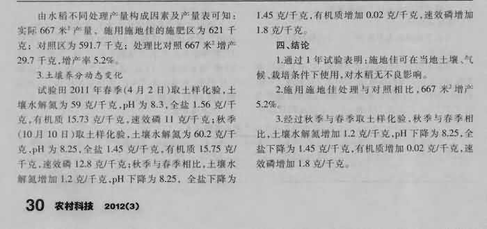 《農村科技》2012年第3期 “施地佳”鹽堿土壤調理劑在水稻地施用效果