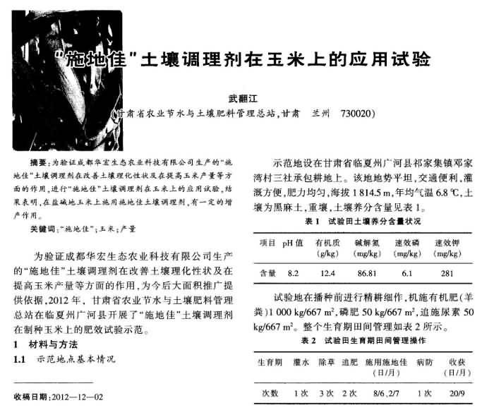 《新疆農(nóng)墾科技》2013年第3期 “施地佳”土壤調(diào)理劑在玉米上的應(yīng)用試驗