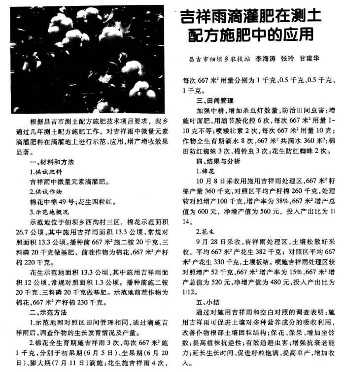 《農(nóng)村科技》2010年第4期 “吉祥雨”滴灌肥在測(cè)土配方施肥中的應(yīng)用