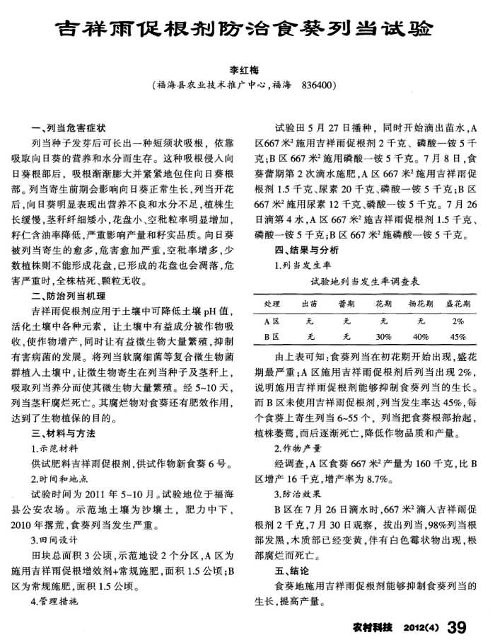 《農(nóng)村科技》2011年第4期 “吉祥雨”滴灌沖施促根劑防治食葵列當試驗