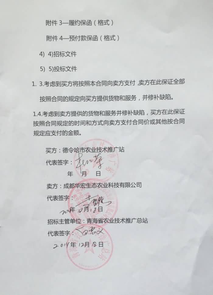 為完成國(guó)家土壤有機(jī)質(zhì)提升項(xiàng)目任務(wù),青海省德令哈市農(nóng)業(yè)技術(shù)推廣站主管并委托青海誠(chéng)德招標(biāo)代理有限公司對(duì)青海省2014年耕地保護(hù)與質(zhì)量提升補(bǔ)助項(xiàng)目進(jìn)行公開(kāi)招標(biāo),接受了成都華宏生態(tài)農(nóng)業(yè)科技有限公司以總價(jià)60萬(wàn)元向青海省德令哈市農(nóng)業(yè)技術(shù)推廣站供應(yīng)經(jīng)過(guò)多年試驗(yàn)示范的可信度極高的鹽堿土壤調(diào)理劑。