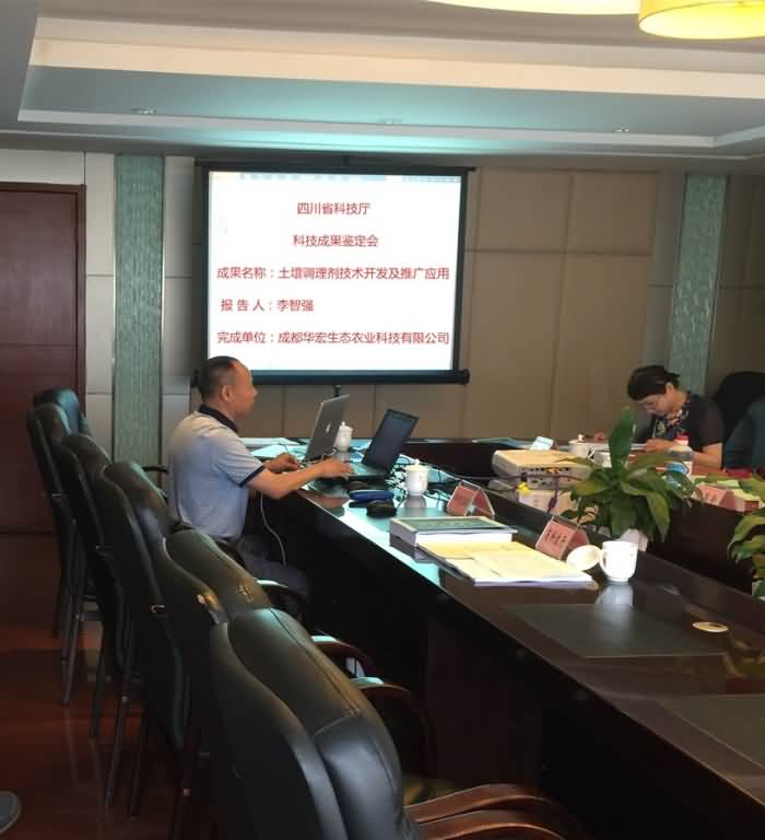 2015年7月7日上午9時,成都華宏生態(tài)農(nóng)業(yè)科技有限公司總經(jīng)理李智強的十年汗水、十年心血研發(fā)的“施地佳”土壤調(diào)理劑科技成果鑒定會在成都市花園賓館四樓會議室舉行,會議由四川省科學(xué)技術(shù)廳負責人主持,四川省土壤、肥料、農(nóng)學(xué)、化工方面的專家共7人組成鑒定委員會。由四川省化工研究設(shè)計院院長徐世林(化學(xué)工程高工)任主任,四川農(nóng)業(yè)大學(xué)土壤學(xué)教授、院長王昌全任副主任,四川農(nóng)業(yè)大學(xué)教授艾應(yīng)偉、四川化工行業(yè)協(xié)會理事長曾祥春、四川省危險品化學(xué)品質(zhì)量監(jiān)督檢驗所高級工程師周磊、成都土壤肥料測試中心副主任研究員李昆、中科院水利部成都山地災(zāi)害與環(huán)境研究所研究員張丹(女)為鑒定委員會委員。四川省科技廳康處長首先闡明了會議主題并逐一介紹了與會專家。接著由成都華宏生態(tài)農(nóng)業(yè)科技有限公司總經(jīng)理—“施地佳”土壤調(diào)理劑的主研發(fā)人李智強代表公司向參會專家匯報該成果產(chǎn)品的研發(fā)過程、技術(shù)指標、經(jīng)濟效益、社會效益等情況。