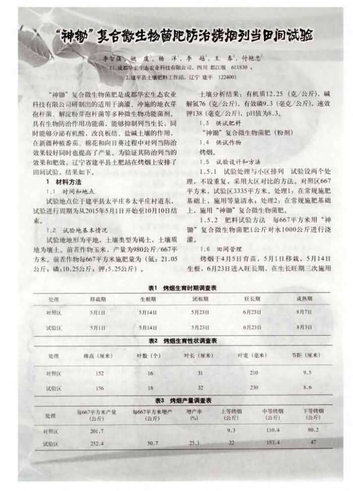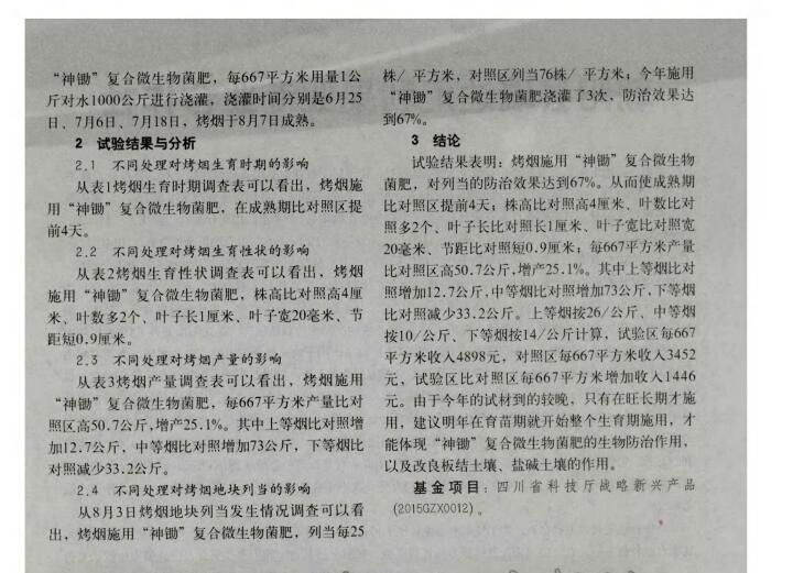 《新農(nóng)業(yè)》2016年 第7期“神鋤”復(fù)合微生物菌肥防治烤煙列當(dāng)田間試驗