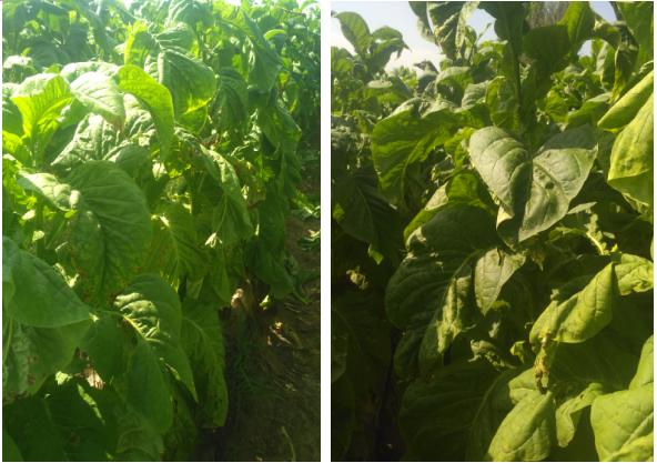 從圖10可以看出,成熟期不施用藥劑的煙株受到列當影響逐漸嚴重,后期煙株已經(jīng)萎縮,而施用藥劑的煙株也有缺鉀的現(xiàn)象但未對煙株造成影響,也開始分層落黃。