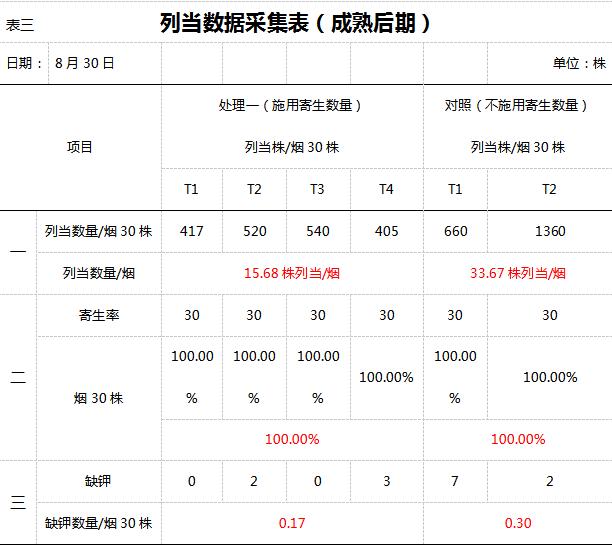 從圖12、表二可以看出成熟后期列當對煙株的影響差異明顯,煙株萎縮嚴重,通過數(shù)據(jù)調(diào)查施用煙株寄生數(shù)量、缺鉀株數(shù)明顯少于對照,但這個時期已經(jīng)到了列當生長的高峰期,寄生率都是百分之百。
