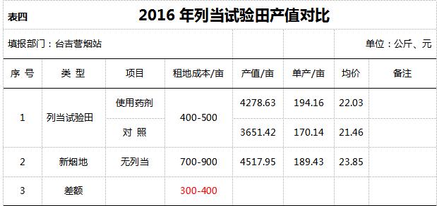 從表四、表五可以看出使用藥劑畝產(chǎn)值高于對照627.21元,單產(chǎn)也高于對照24.02kg,而使用藥劑跟臺吉營片區(qū)平均產(chǎn)值4517.95元對比,也只相差239.32元,每畝藥劑成本348.00,租地成本加藥劑成本與無列當煙地租金接近,所以不使用藥劑的煙田列當對產(chǎn)值影響超過20%,而施用藥劑的對其影響降到了5%。