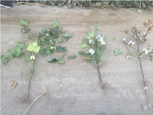 為了驗證其在棉花上的抗病效果,華宏技術團隊于2016年首次在該棉田進行試驗,試驗全部采用棉花膜下滴灌栽培技術,從4月下旬播種期開始到9月取樣測產(chǎn),分別在試驗區(qū)和對照區(qū)各選三個調查點進行定點調查棉花長勢。試驗發(fā)現(xiàn),施用“神鋤”的棉花在蕾期、花鈴期、鈴期、枯黃萎病病株均明顯低于未施“神鋤”的種植地,未施“神鋤”的對照區(qū)棉花在三個生育期發(fā)病率分別較施用“神鋤”的棉花增加89.4%、88.0%、84.9%,而且出現(xiàn)黃枯萎病的棉花以及整株干枯死亡的現(xiàn)象。