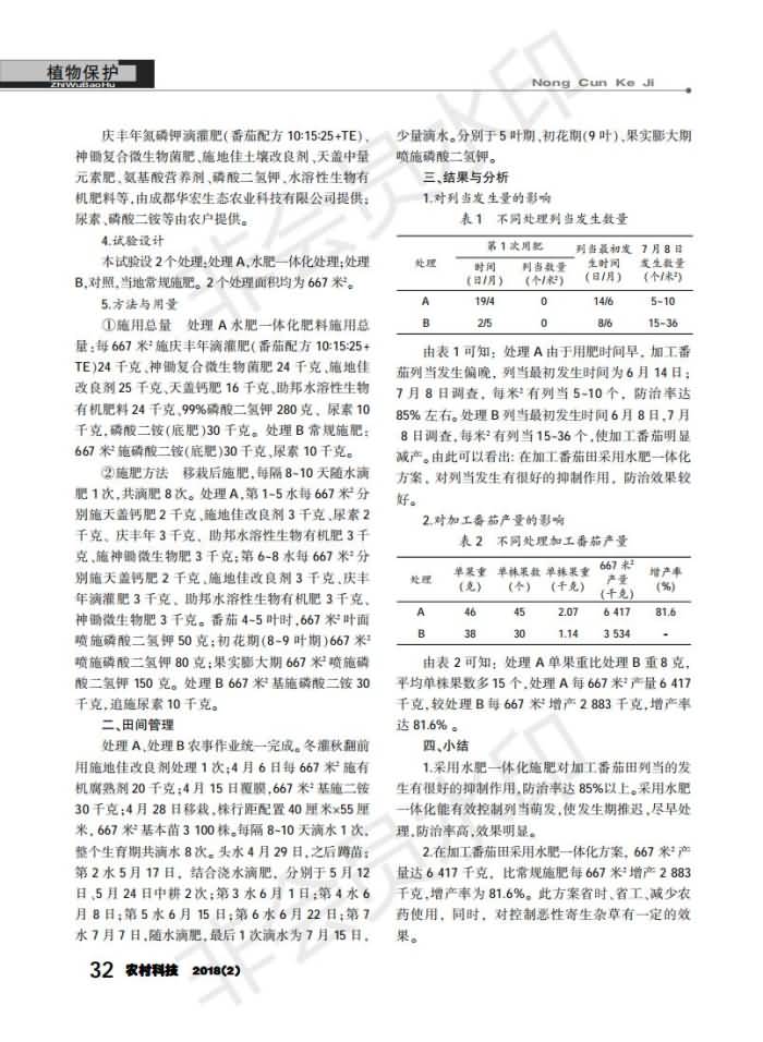 水肥一體化防治加工番茄列當效果試驗