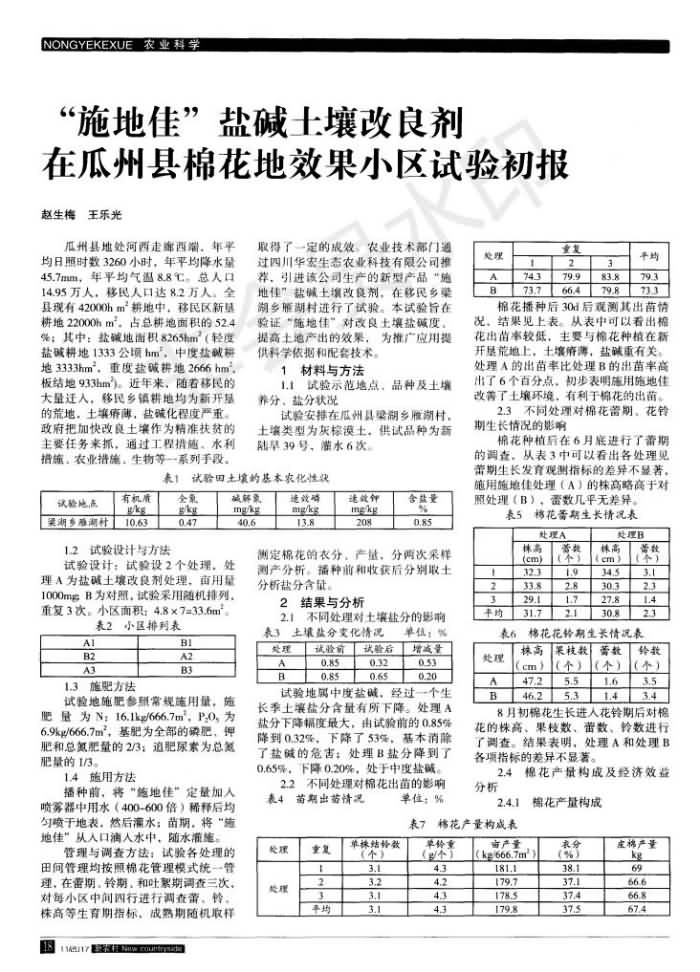 “施地佳”鹽堿土壤改良劑在瓜州縣棉花地效果小區(qū)試驗(yàn)初報(bào)