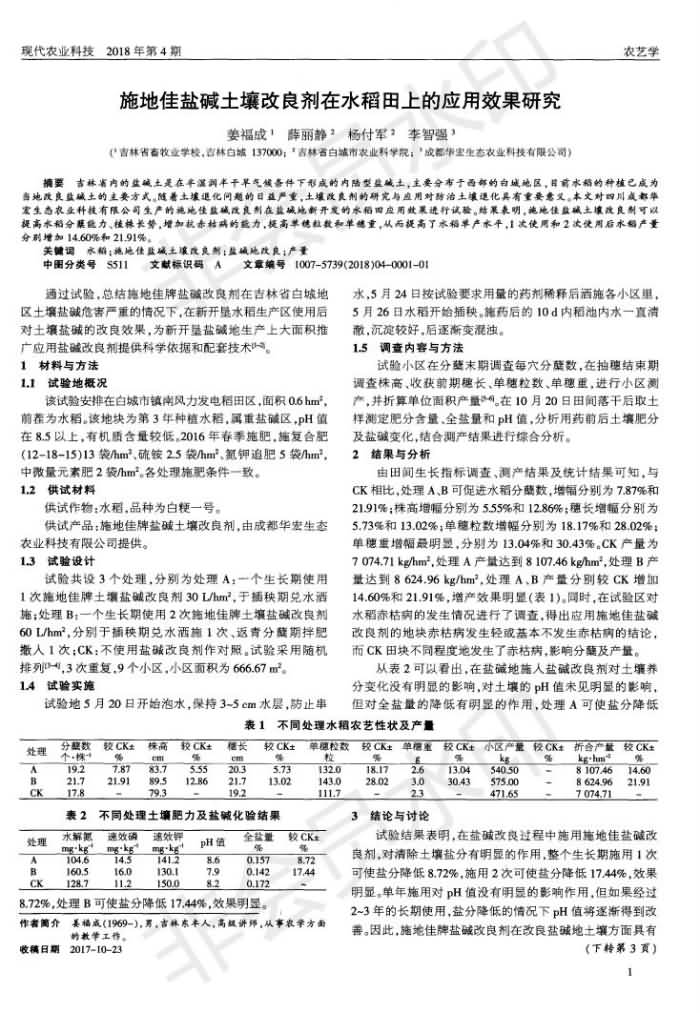 施地佳鹽堿土壤改良劑在水稻田上的應(yīng)用效果研究