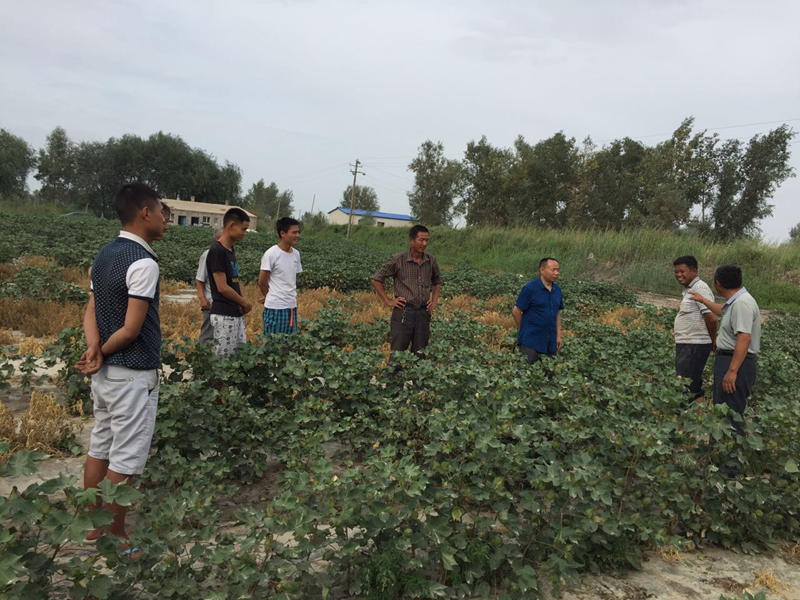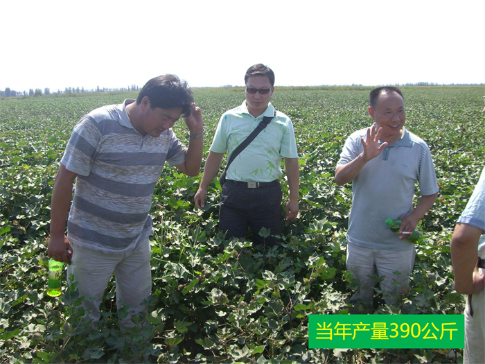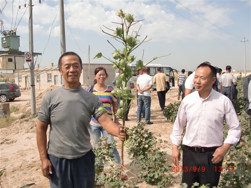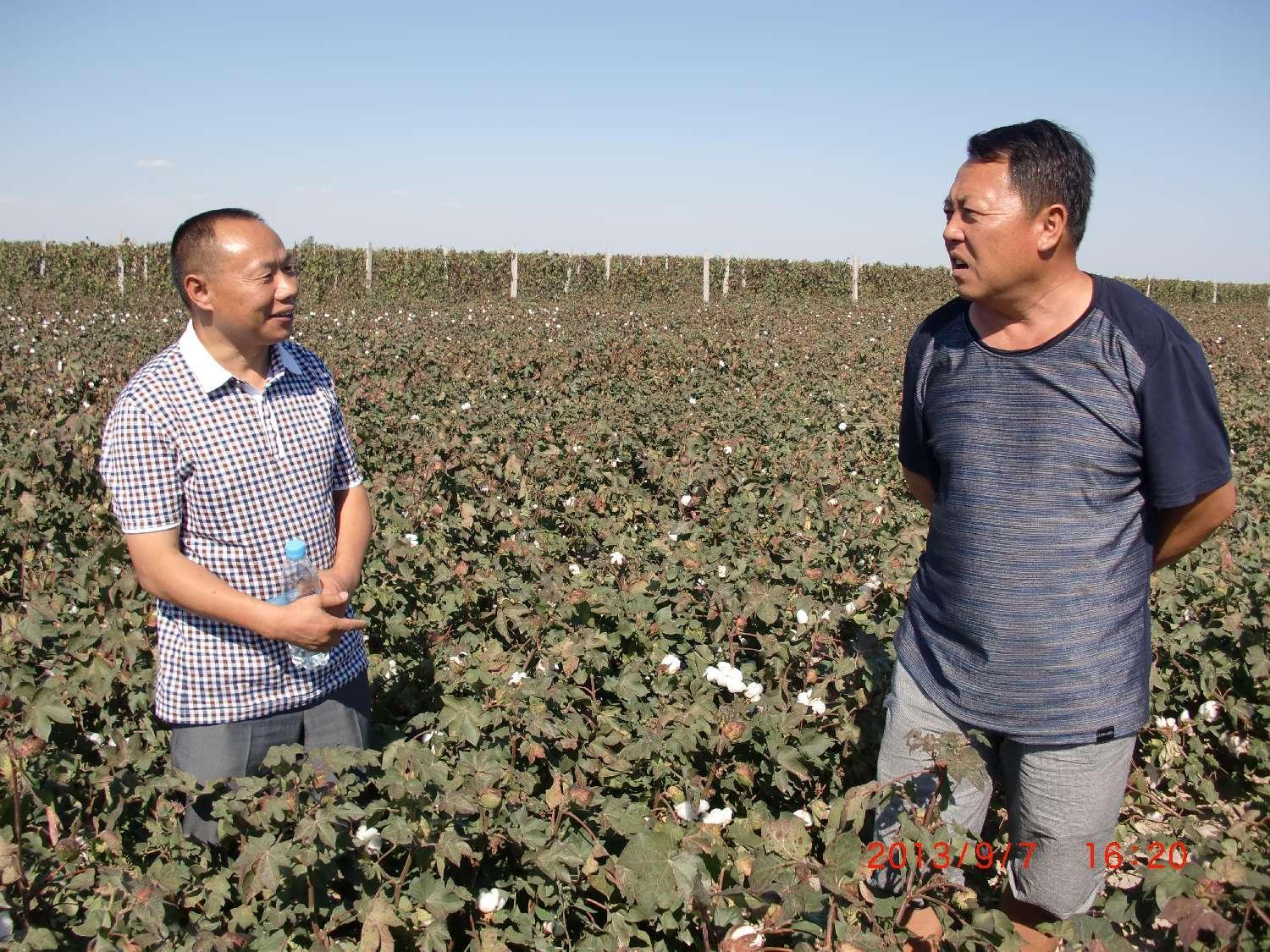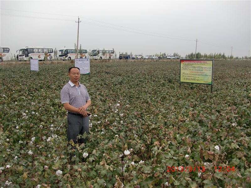 2014年呼圖壁縣張學(xué)勇家庭農(nóng)場2000畝連作30年棉花黃枯萎病逐年加重,2013年畝產(chǎn)200公斤,2014年實(shí)施了我們的方案1000畝,9月6日公司總農(nóng)藝師劉軍在示范地觀察 。