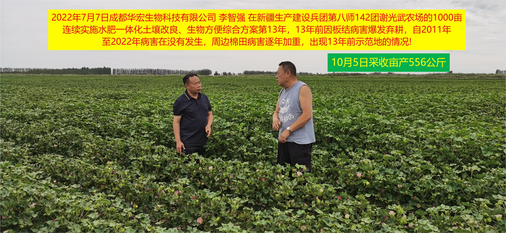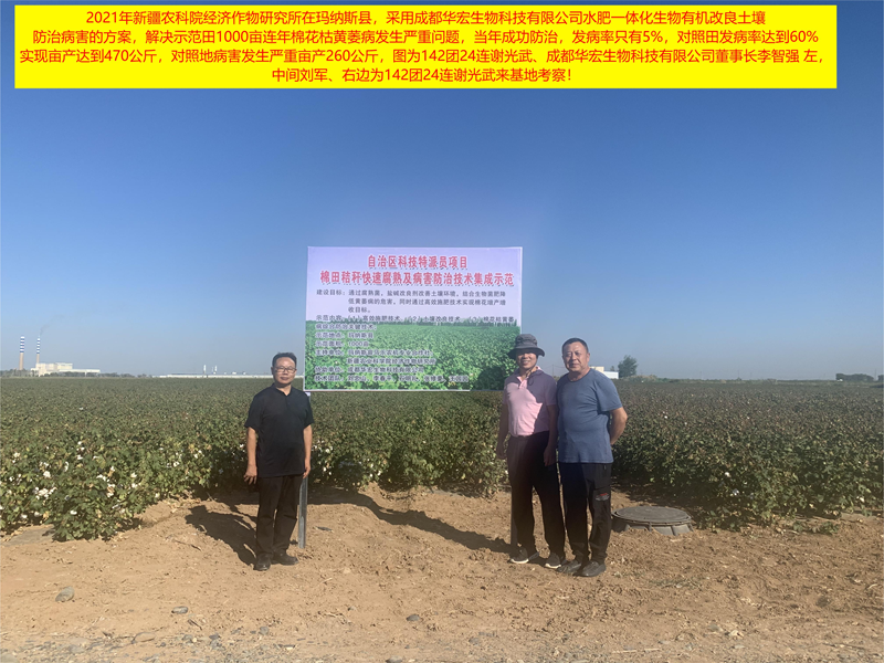 2021年新疆農(nóng)科院經(jīng)作所劉忠山教授,他們的示范基地1000畝老棉田,枯黃萎病逐年加重,實(shí)施了很多方案,沒有達(dá)到理想效果,了解我們的方案后,實(shí)施了500畝,當(dāng)年防效達(dá)到95%!