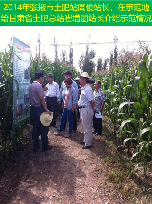 2014年農(nóng)業(yè)部全國農(nóng)技中心組織在張掖召開新型肥料,我們的土壤改良玉米示范地,楊帆處長、董艷博士聽張掖市土肥站毛濤站長匯報(bào)實(shí)驗(yàn)情況